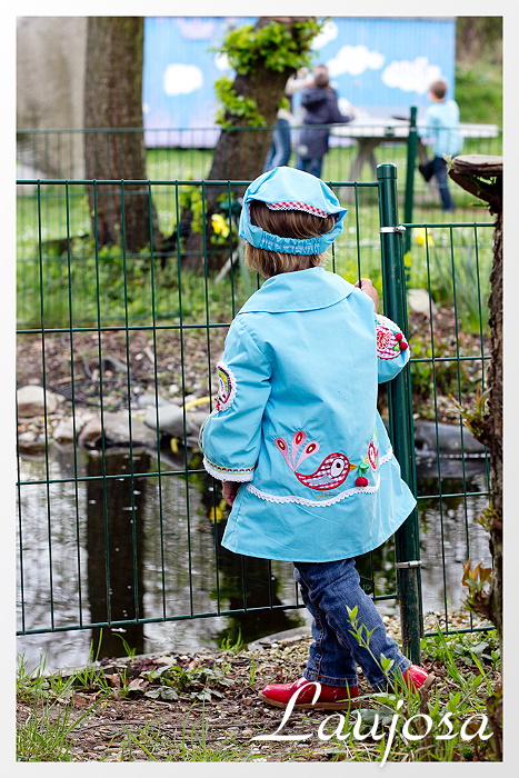 Hier ein Frühlingsjäckchen nach dem Farbenmixschnittmuster Rabea mit passendem Kopftuch ( Bandito). Verschönert mit den süßen Lovechirp-Stickereien von Huups.